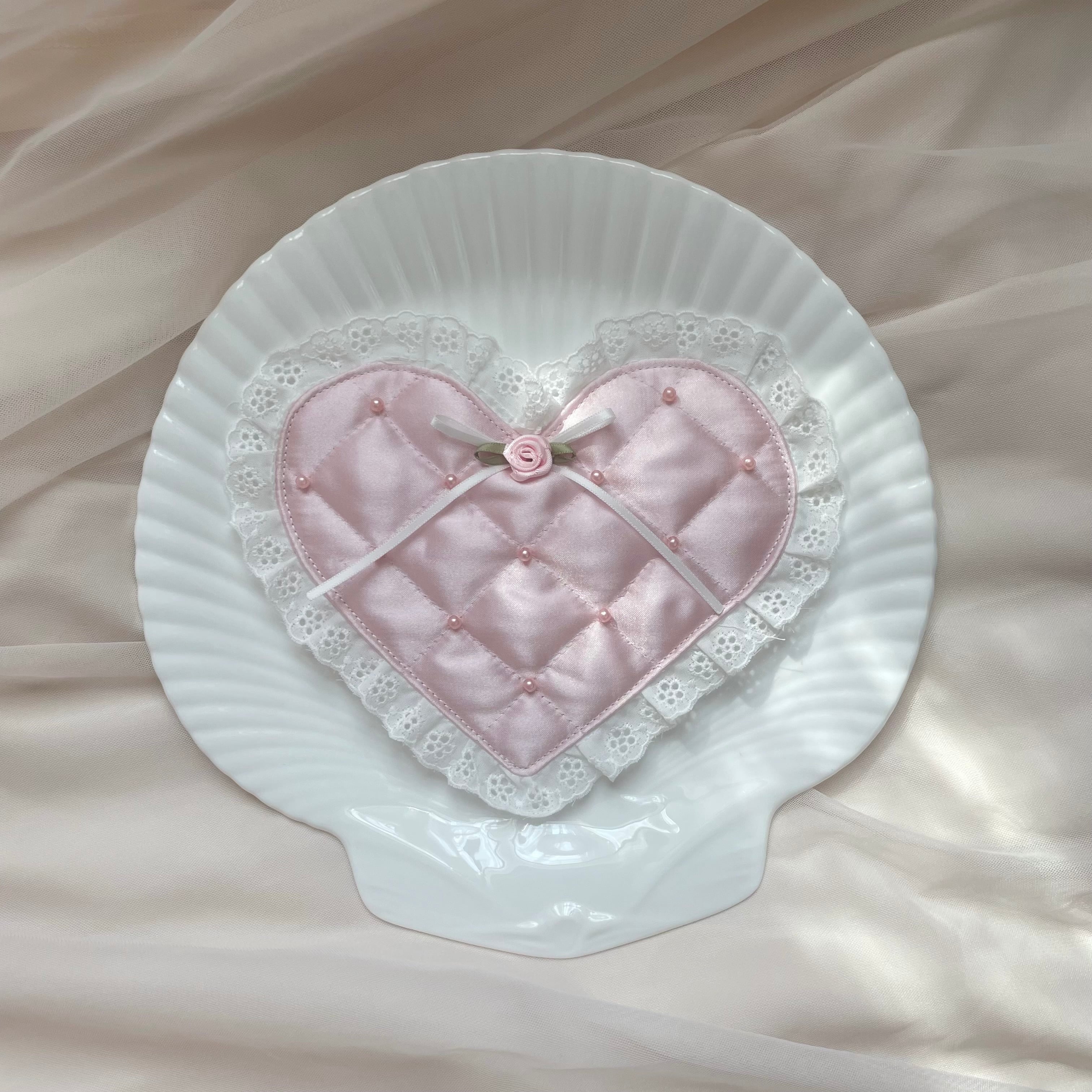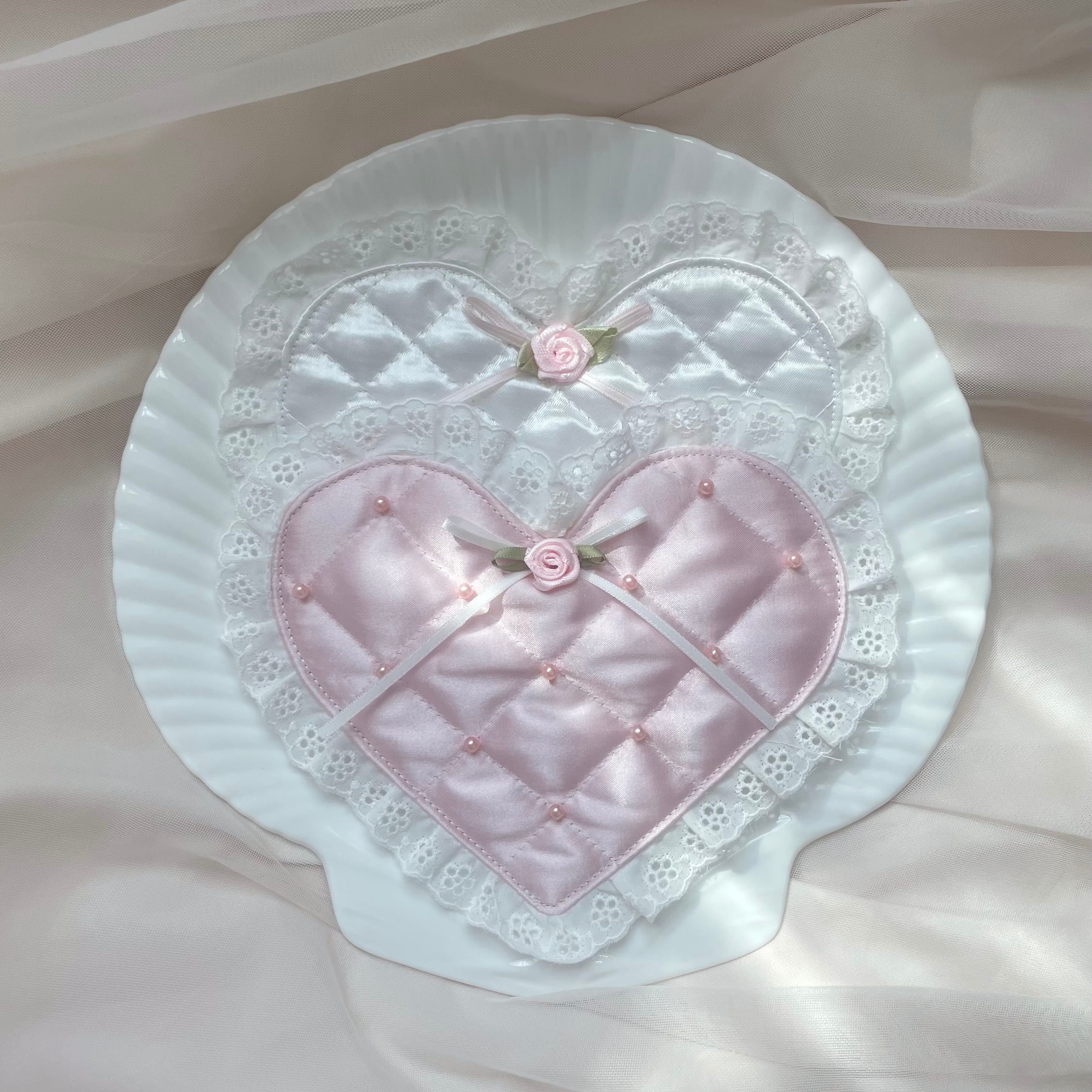 サテンのつやめきとふんわりしたキルティングが愛らしい、ハート型のコースターです。