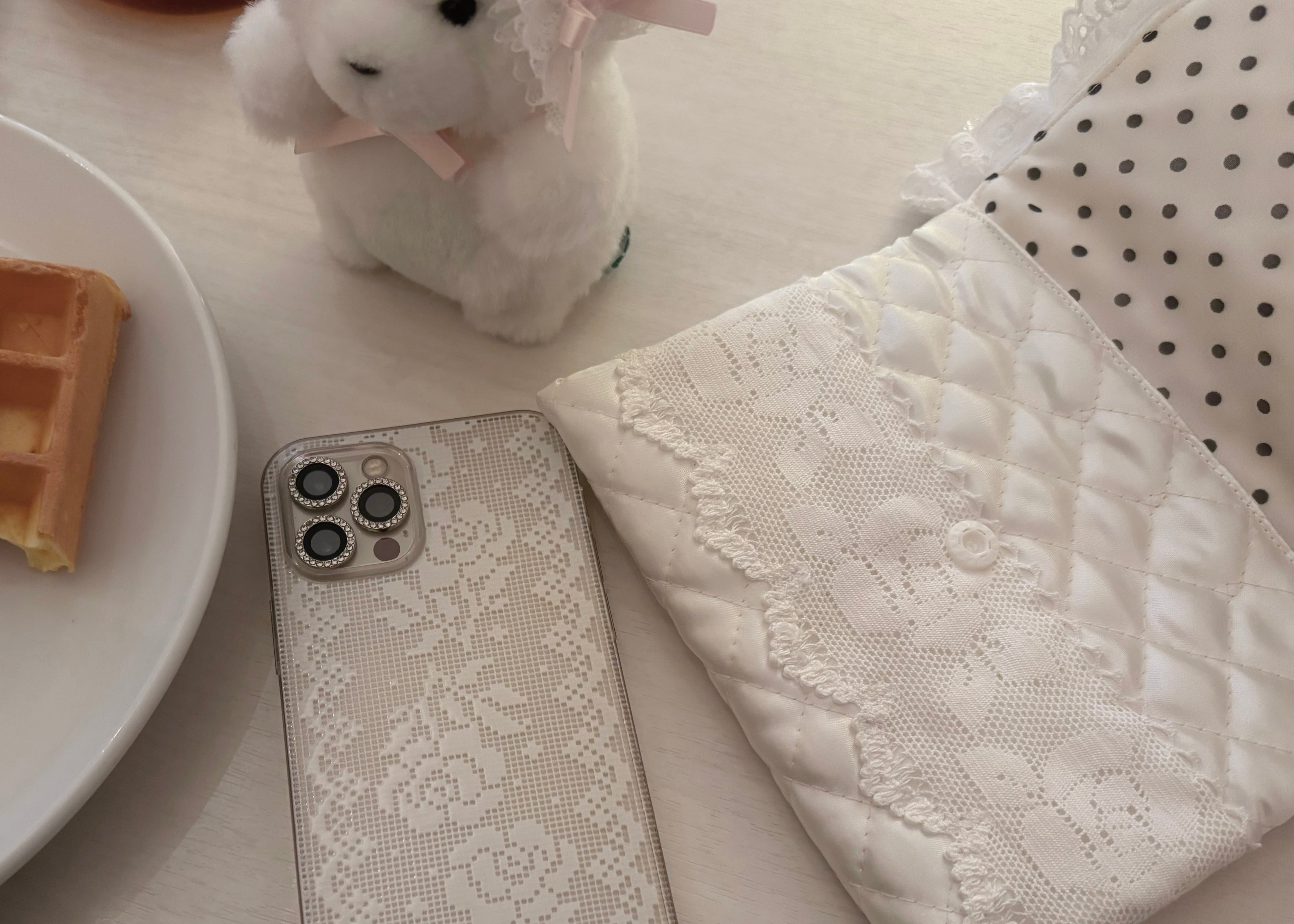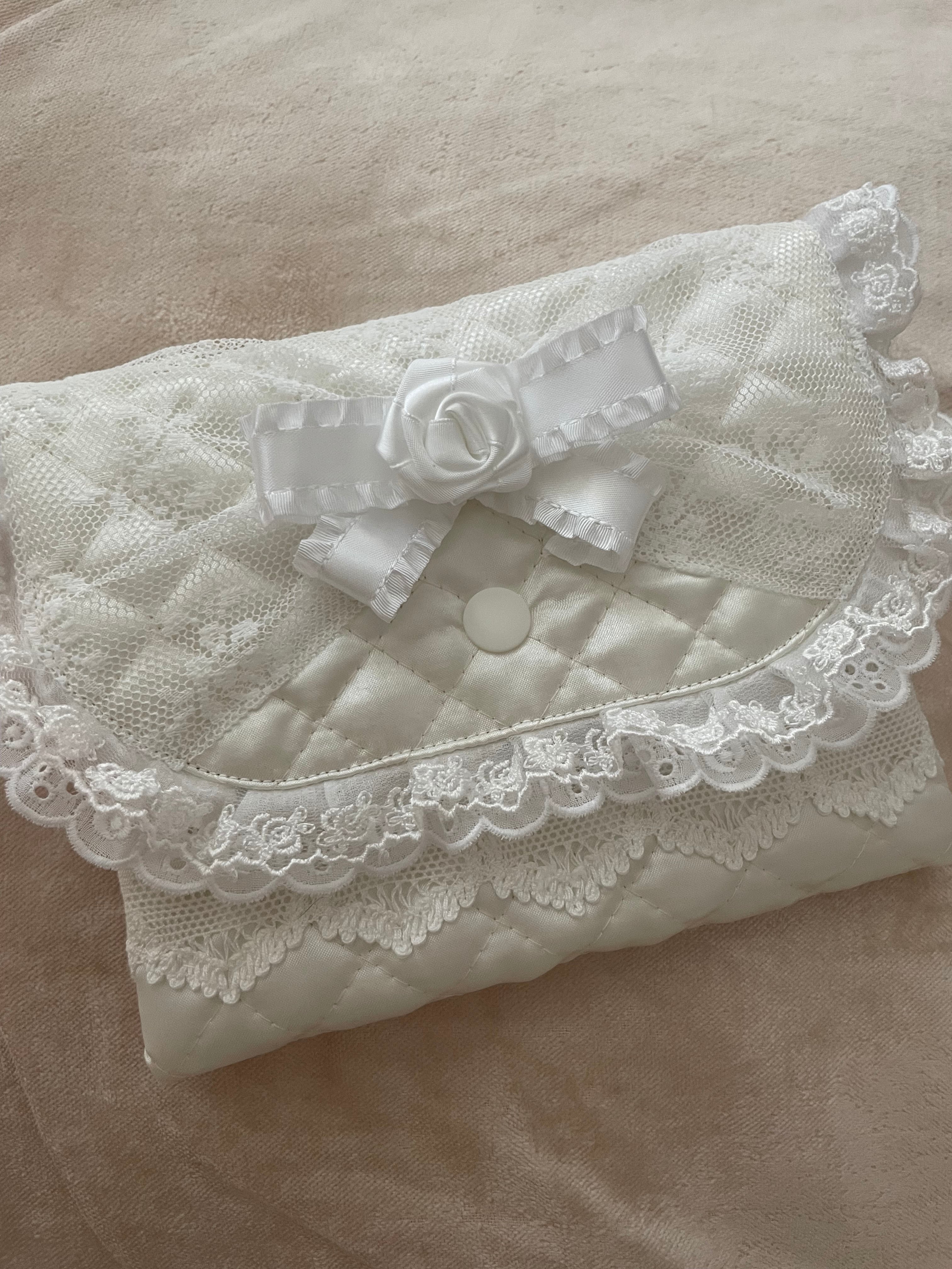 生クリームのようにあまくとろけるアイボリーのキルティング生地にローズモチーフの繊細なレースをふんだんにあしらった高級感たっぷりのロマンティックなポーチです。